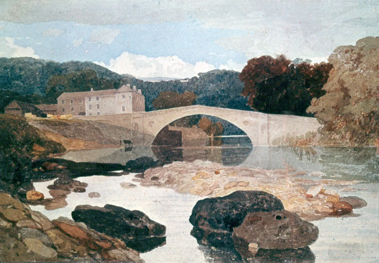 Greta bridge; view from the bank of the river Tees with rocks in the foreground, a single-arched bridge in the mid-distance, a house at left, trees beyond. c. 1805