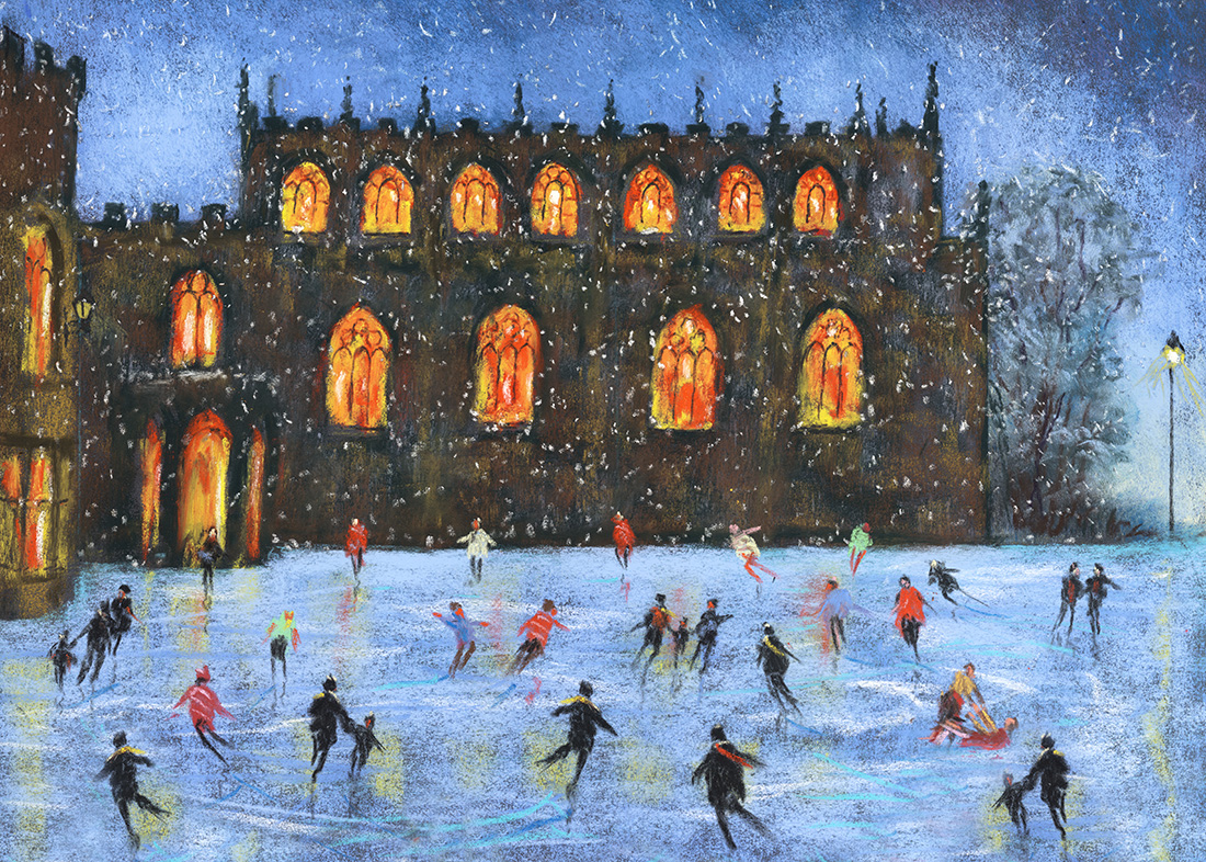 Skaters outside the chapel in Bishop Auckland Castle grounds.