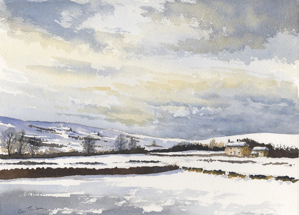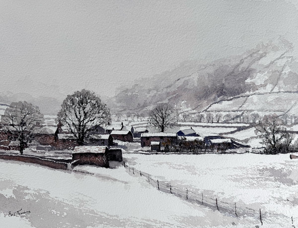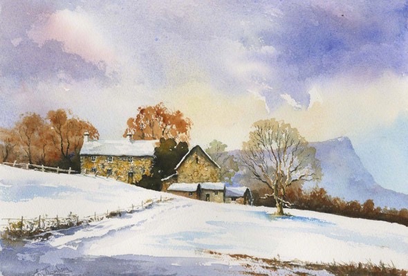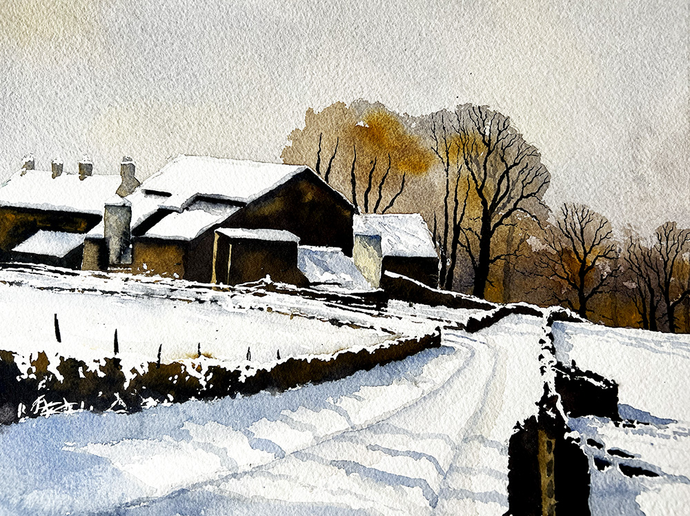 A Dales farm in winter showing how to paint snow. Tip, you don't need to, just leave the paper.