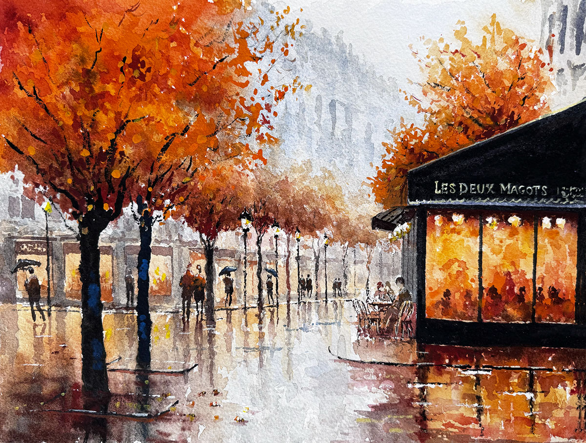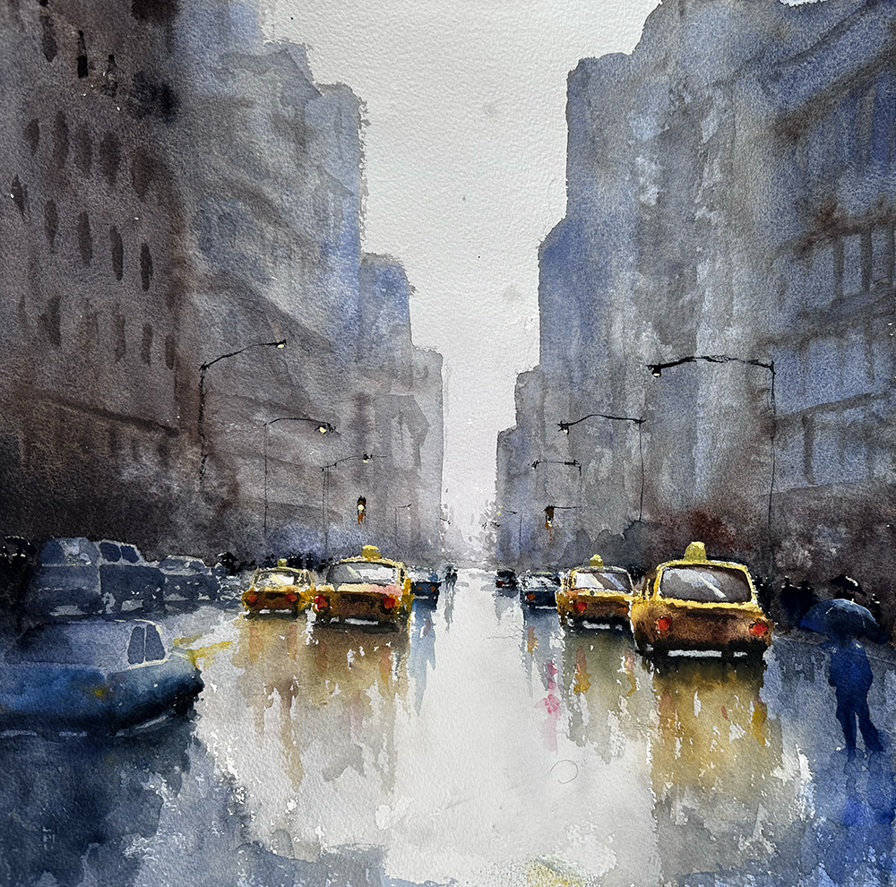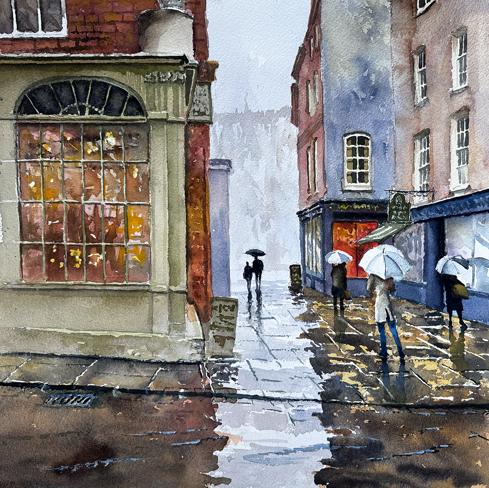 Wet streets painting of High Petergate, York. How to paint reflections.