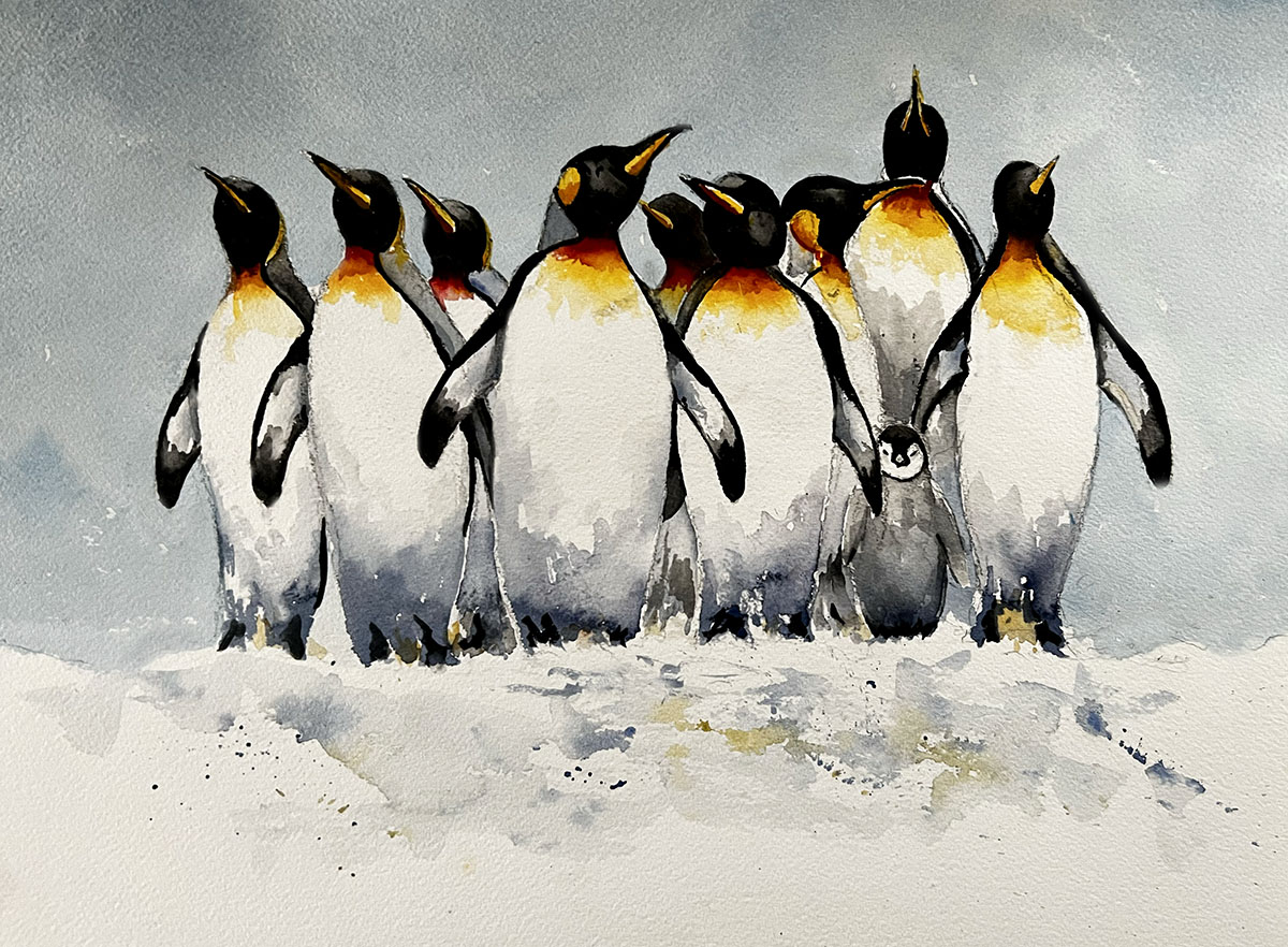 Have a go at painting your own Christmas cards. Kids sledging in the park or penguins in the snow.